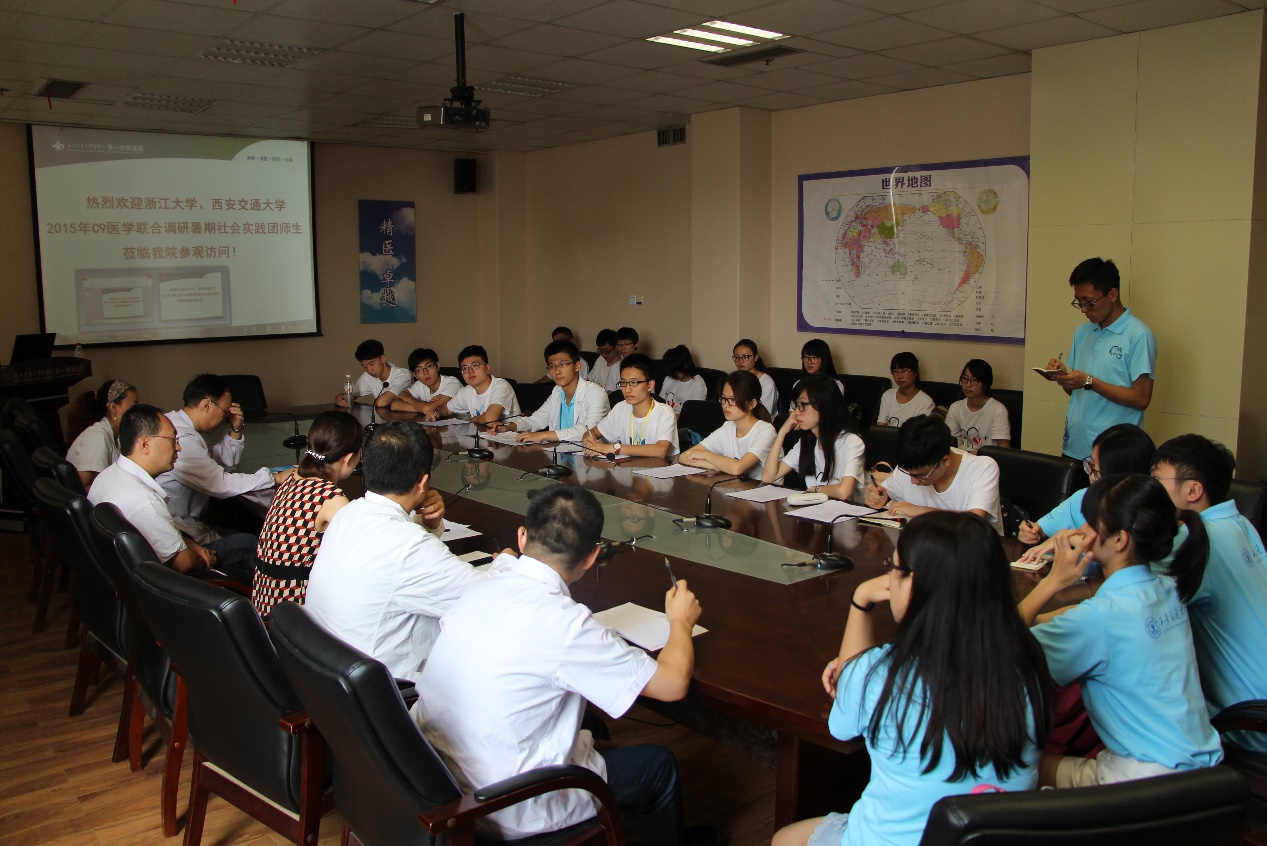 2015年7月17日,浙江大学与西安交通大学暑期社会实践联合调研团队顺利完成了对西安交通大学第一附属医院(以下简称“交大一附院”)的参观访问。交大一附院团委主任陈阳静、分级诊疗办公室主任刘庆、胸外科医师温晓鹏、分子检验科医师胡建及重症监护室医师郭立涛出席并指导了此次访问交流会。会议围绕着此次社会实践的核心调研问题展开,各位“有备而来”的医师们就“分级诊疗”、“移动医疗”、“医研结合”及“卓越医师成长之路”等热门话题进行了精彩的分享,送出了满满的“医学干货”,让在座的医学生们大呼过瘾。