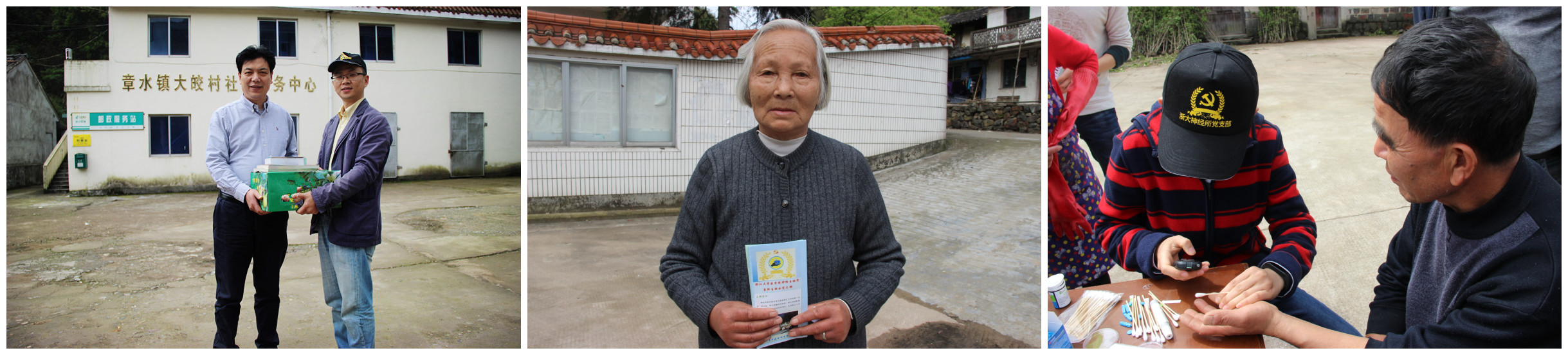 4月10日上午,在鄞州区章水镇大皎村书记徐鹏祥的大力支持下,支部成员来到当地社区,并结合自身医学背景的相关专业知识为社区老人进行了体检与健康咨询服务。支部成员分成三个小组:第一小组负责给现场老人测血糖、血压并向她们讲解相关用药知识,第二小组负责现场与社区内健康手册的发放,第三小组负责派发问卷、调查社区老年人的现状与实际需求情况。在探访过程中,我们了解到大皎村的青年人都基本在外上班,社区主要以当地老年人以及外来务工人员的子女为主,老年人平时生活比较单调。根据我们的调查统计,该社区老人年龄段集中在为70-79岁之间,大多是夫妻共同居住的农民为主,身体总体状况都比较健康,但高血压及风湿是困扰老人们的主要疾病,老人们的经济状况基本能维持自足。在将近40份的调查问卷中,对国家现行的社保医疗制度态度表现为“非常满意”的占了40%,可见社区老人总体具有较高的幸福指数。活动最后,杨巍书记代表支部为当地学生带去了支部成员前期募捐而来的图书文本,希望孩子们能够更好的学习知识、为当地的发展建设贡献自己的绵薄之力。