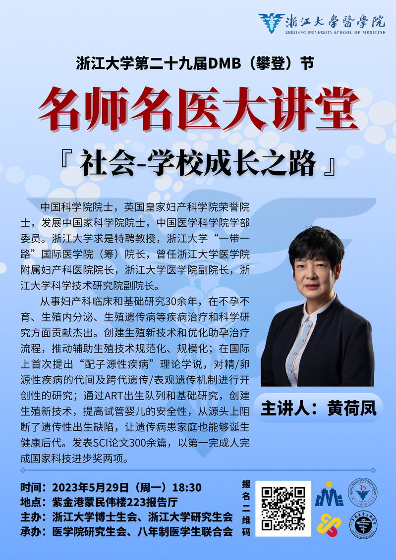 为深入学习贯彻习近平新时代中国特色社会主义思想、党的二十大精神、习近平总书记对浙江大学重要指示精神、学校第十五次党代会精神及学习科学家精神,进一步引导全校广大同学勇担强国使命,助力学科高原筑峰,以更加优异的成绩推进学校“十四五”发展和“双一流”建设,为建设中国特色世界一流大学贡献青春力量,医学院举办浙江大学第二十九届DMB(登攀)节之医学院名师名医大讲堂,邀请黄荷凤院士开展主题宣讲,畅谈医学历史与科学前沿、分享从师从医实践经验与成长之路、与青年学生展开深入交流,凝聚奋进力量,共创新的辉煌。本次活动同时作为《形势与政策Ⅱ》的课程选修环节之一,请有关同学相互转告提醒、并准时参加。