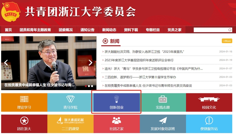 网站路径1:校团委主页-点击中间“创新创业”蓝色图标跳转至报名页面