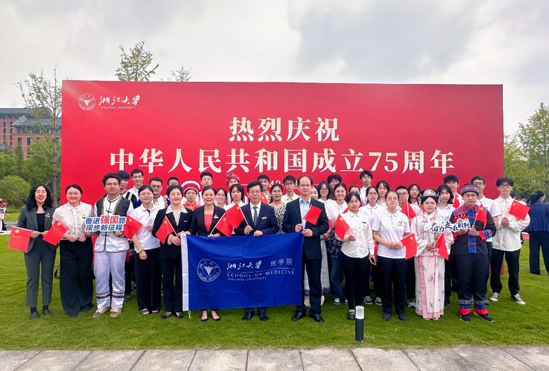 华家池校区,升旗仪式在奔马广场庄重举行。医学院师生,心怀家国,志在四方,用青春誓言告白祖国情深意长。
